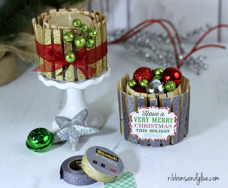 For the Gold Glitter Tape Clothespins, I wrapped red ribbon around the can to turn it in to a candle holder