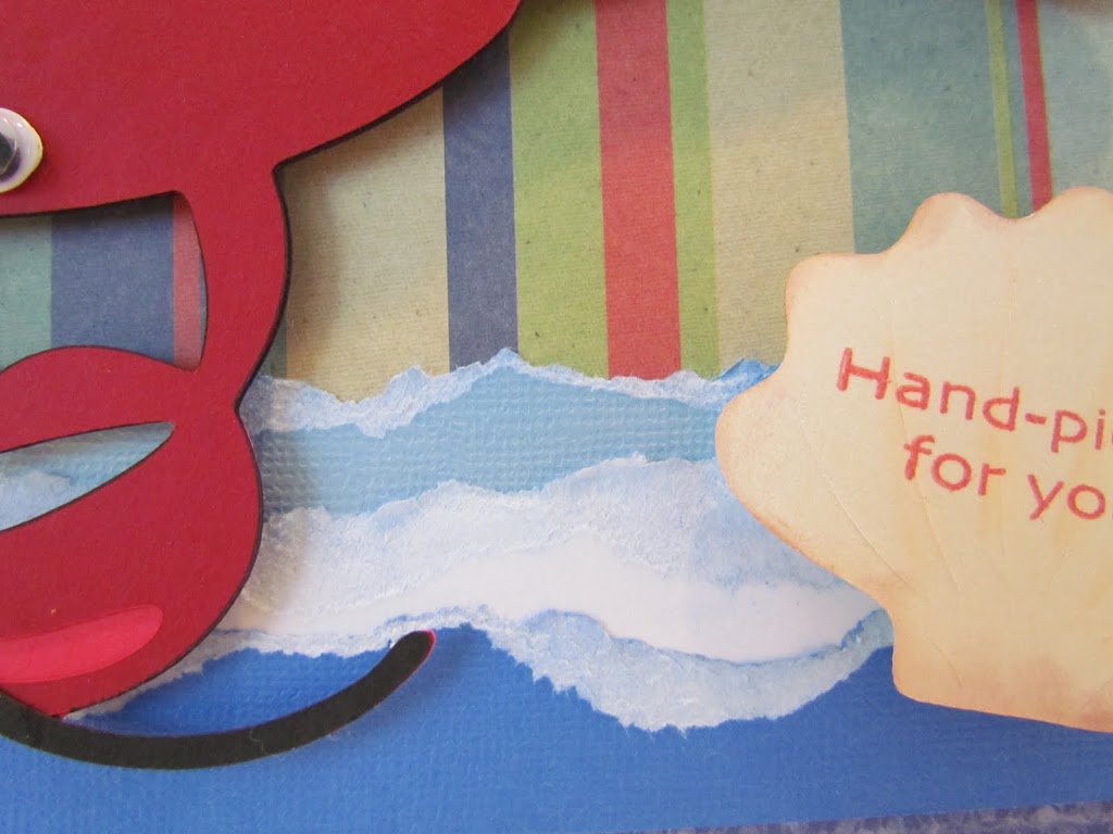 I tore and chalked card stock to make the water and waves and stamped a sentiment from on a sea shell which was cut from Paper Dolls Cartridge.